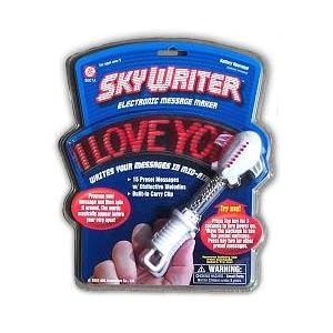 Product Description : Display your message in mid-air on the Skywriter's magical "airplane". Just spin the airplane and your message will appear in mid-air in front of you. This message maker uses super-fast blinking LEDs combined with your eye's persistence of vision to create visible messages by simply spinning the device. The SkyWriter has 15 great preset messages to cover all occasions, and plays distinctive melodies to match! You can also easily program a message of your own, including using symbols. A built-in carry clip makes the already small SkyWriter even more convenient. Uses 3 replaceable AG-13 batteries (included). For ages 5 and up. Makes a fascinating gift! Pre-set Message Library: 1) I Love You 2) Be Happy! 3) Lets Party! 4) Go! Go! Go! 5) Score! 6) Bravo! 7) Help 8) Smile 9) Merry X'mas 10) Happy New Year 11) Happy Birthday 12) Good Bye 13) Trick Or Treat 14) We Are No. 1 15) I (heart) America Plus create your own message easily by just pressing the buttons on the device! Great for special events, concerts, parties, parades, and more.